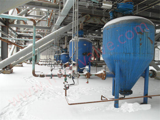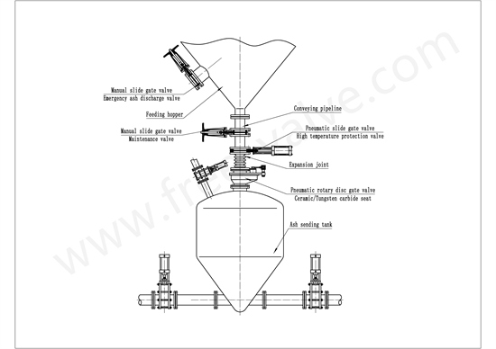 The pneumatic ceramic rotary disc gate valve is an essential component as feeding valve in pneumatic conveying system. During material transfer, the feeding valve must shut off and provide complete sealing to isolate the sending tank from the feed hopper while maintaining internal pressure in the sending tank. The expansion joint compensates for thermal expansion and contraction and facilitates equipment disassembly. As shown in the figure, combining manual slide gate valves, pneumatic slide gate valves and ceramic rotary disc gate valves achieves the desired process functions.